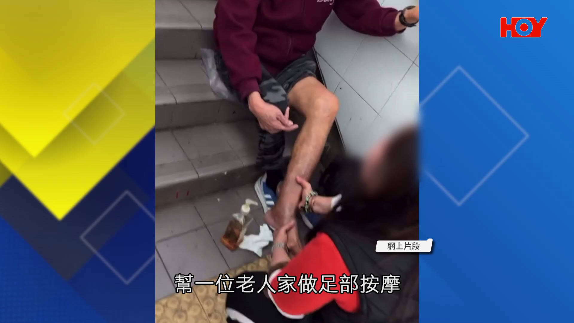 根據網民上載影片顯示,中環站A出口行人天橋樓梯,有人坐在梯級為一位長者做足部按摩,樓梯較高位置更有人排隊等候。片主指除了按摩外,更有人提供修腳皮服務,直言由於現場很大風,「行上去每一步好似食晒啲腳皮嘅feel」。