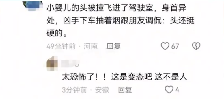 【有線新聞】江西一名男子去年因與女友口角,氣憤下狂踩油門,飆至時速129公里,更失控撞向斑馬線行人,最終導致一家三口無辜喪命,包括一名未滿1歲嬰兒。兇徒犯案後不但未有悔改,竟下車抽煙而非報警,更冷血調侃稱「小孩頭挺硬」,而其父亦以「天災」推諉車禍原因,隨即引起網民熱議。