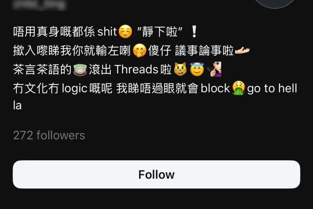 隨著網民「起底」及投訴浪潮升溫,發帖者隨即刪除相關帖文,並將Threads帳戶設為私人,試圖平息風波。然而,有網民發現其個人簡介再更新逾百字內容,疑似挑釁網民:「唔用真身嘅都係shit,靜下啦!撳入嚟睇我你就輸咗喇,傻仔,議事論事啦,茶言茶語的『綠茶』,滾出Threads啦,冇文化冇logic嘅呢,我睇唔過眼就會block,go to hell la」。