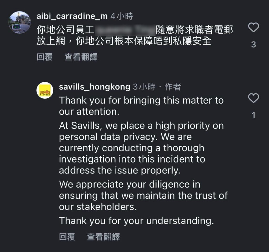 此番言論火上加油,網民批評其毫無同理心,甚至有人「起底」,大批網民湧入涉事公司社交平台投訴,批評其職員洩露求職者個人資料,私隱管理漏洞令人失去信心。