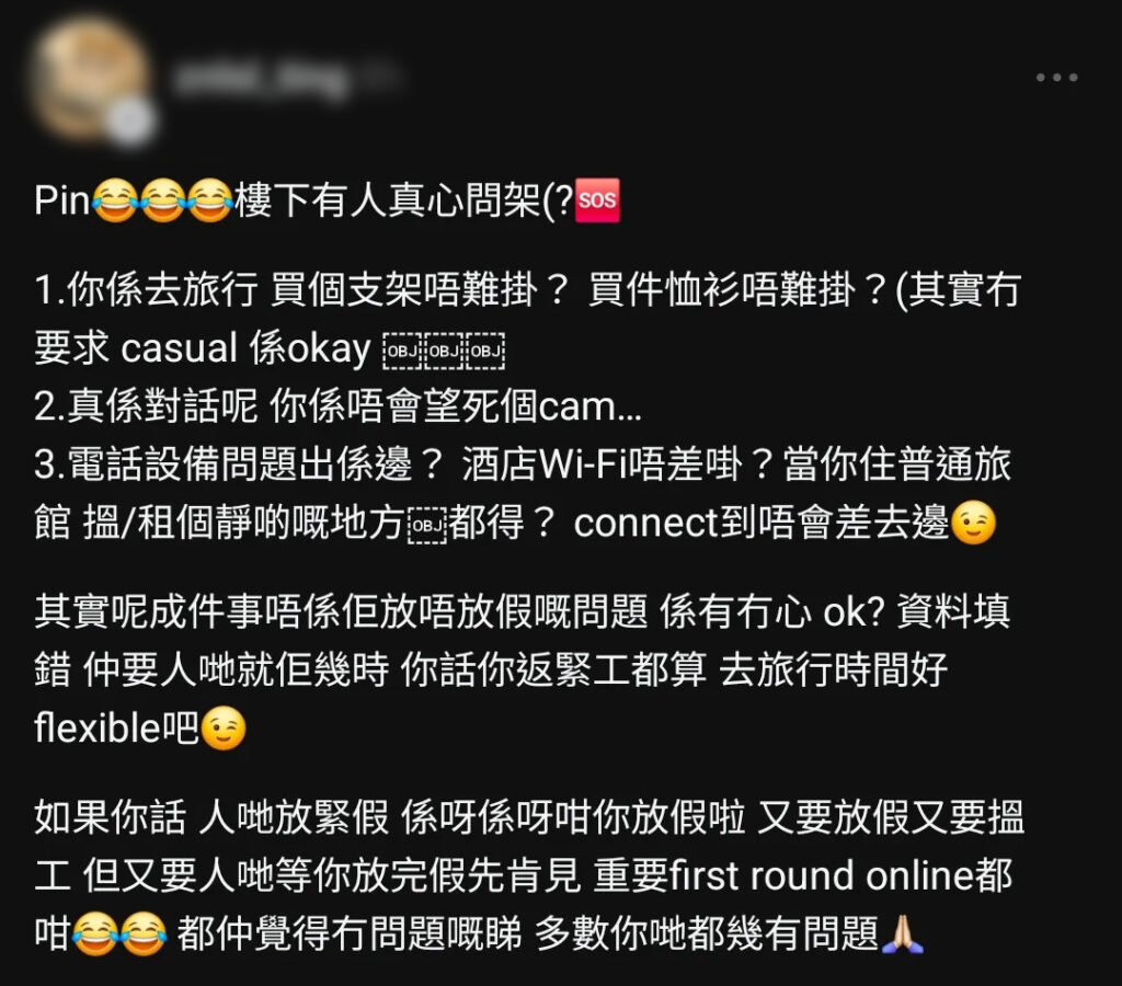 面對網民圍剿,發帖者未有收斂,繼續以強硬態度回擊,稱事件重點在於求職者「有冇心」,「其實呢,成件事唔係佢放唔放假嘅問題,係有冇心,OK?資料填錯,仲要人哋就佢幾時,你話你返緊工都算,去旅行時間好flexible吧」。她又指,首輪僅為網上面試,即使去旅行亦可進行,「買個支架唔難啩?買件恤衫唔難啩?」、「如果你話人哋放緊假,係呀係呀咁你放假啦,又要放假又要搵工,但又要人哋等你放完假先肯見……都仲覺得冇問題嘅,多數你哋都幾有問題」。