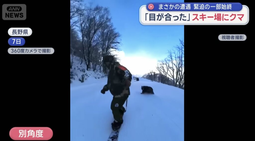 據日本《ANN》報道,事發在本月7日早上8點30分,事主當時在白馬地區的滑雪場滑下雪坡,並使用了360度全景攝影機拍攝過程。影片可見,男事主滑行約40秒後,後方左側突然出現了一個黑影,影似乎正朝他跑來。他察覺後迅速滑到安全的地方。當時附近纜車上有旅客亦目睹事件,隨即聯繫了滑雪場。