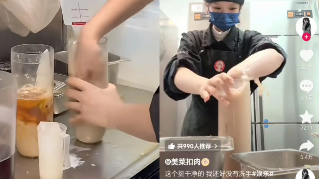 涉事員工在抖音上發布影片,可見製作飲品時全程未有佩戴手套,她先將冰塊砸碎後散落枱面,再徒手執入杯中,繼而徒手「擳」檸檬片,再赤手空拳「揼」杯內的檸檬片及冰塊。更令人咋舌的是,該店員隨後將整隻手插入杯中,把紅茶沿著手臂倒入,更將工作枱上灑落的奶茶用手「刮」入杯中徒手攪拌。