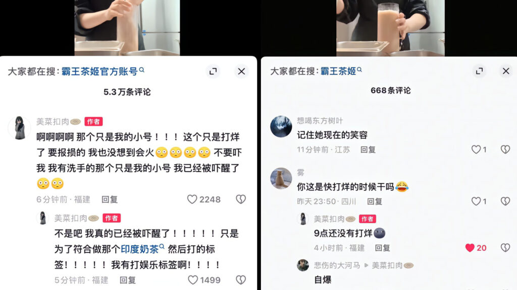 影片在網上瘋傳並衝上微博熱搜,大批網民留言怒轟「我們叫的外賣是不是也這樣做的」、「以後還敢飲霸王茶姬嗎」。涉事店員起初辯稱是打烊後使用報廢物料進行拍攝,只是為模仿網上流行的「印度奶茶」影片博取流量,「我也沒想到會火,不要嚇我。我有洗手的,那個只是我的小號」。有內地媒體取得另一角度影片,顯示事發於為晚上9時,店舖尚未打烊。涉事帳號隨後已轉為私密。