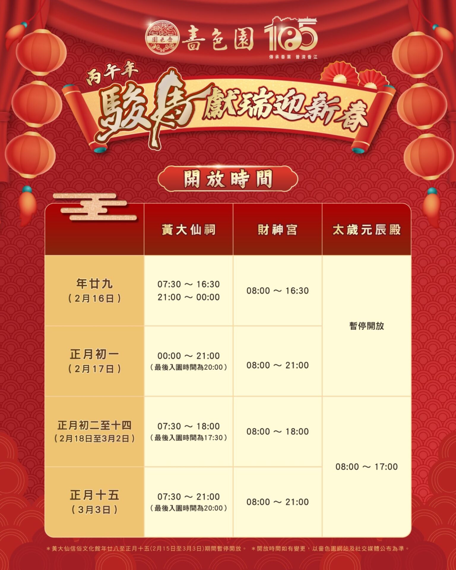- 年廿九下午4時半後,財神宮、太歲元辰殿、月老殿及從心苑將暫停開放。