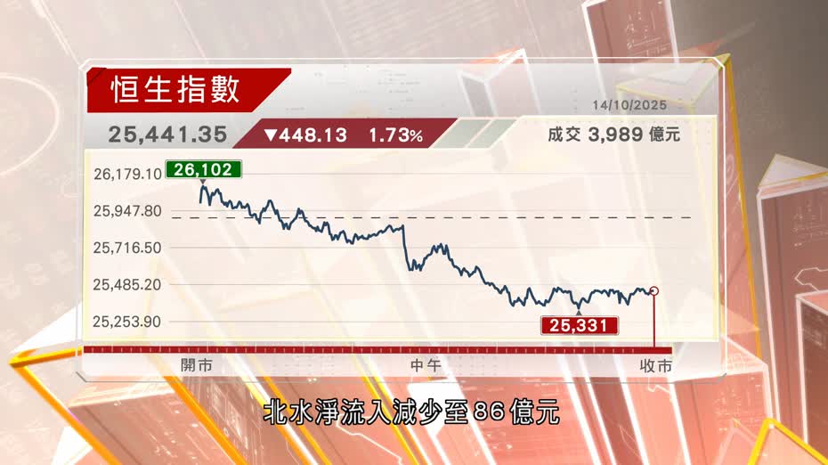 股市直播室(14/10/2025) 恒指7連跌累瀉1845點,5個月以來首度收市失守50天線 財經資訊 2025年10月14日 To view this video please enable JavaScript, and consider upgrading to a web browser that supports HTML5 video 主持:黃皓琳 嘉賓:蘇沛豐 金馬資本交易策略師 收市焦點: 。恒指收跌448點、7連跌錄21個月以來最長跌市 。國指和科指收跌1.55%及3.61% 。科指成分股僅京東健康逆市靠穩 。中芯跌8.48%最差藍籌,華虹挫13%最差科指成分股 。百度挫5.35%,阿里跌4.3% 。招行升4.69%最佳藍籌,建行和工行升2.32%及1.76% 。新華保險盈喜漲3.5%,國壽及平保升1%